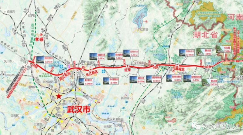 合肥至武漢段是沿江高鐵7個項目中的一個,位于安徽、湖北境內(nèi),設(shè)計時速350公里,新建正線全長330.1千米,建設(shè)工期4.5年,估算總投資792.5億元,線路東起安徽省合肥南站,途經(jīng)六安北、金寨東、南溪、麻城北、紅安、長江新區(qū),終到武漢天河站,橋隧比高達(dá)88.6%。