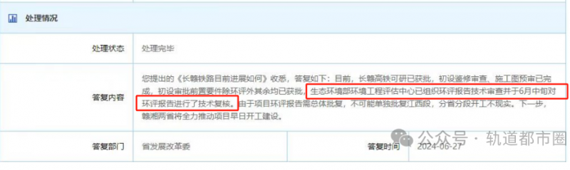 長(zhǎng)贛高鐵項(xiàng)目環(huán)評(píng)因受湖南省長(zhǎng)沙市噪聲治理問(wèn)題影響尚未批復(fù),目前正在積極協(xié)調(diào)中。今年3月,生態(tài)環(huán)境部環(huán)評(píng)中心組織長(zhǎng)贛高鐵環(huán)評(píng)報(bào)告技術(shù)審查并通過(guò),但生態(tài)環(huán)境部、國(guó)鐵集團(tuán)及湖南省之間存在較大分歧。