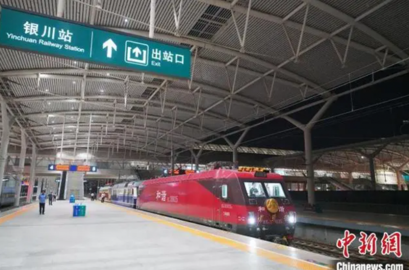 由“雷鋒號(hào)”機(jī)車(chē)擔(dān)當(dāng)?shù)氖滋藷峄囼?yàn)列車(chē)從銀川車(chē)站駛出。中國(guó)鐵路蘭州鐵路局集團(tuán)有限公司供圖