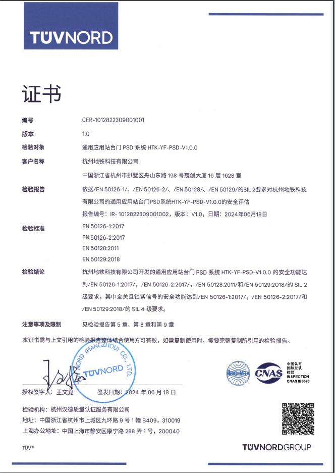 通過此次SIL2安全認(rèn)證,進(jìn)一步驗(yàn)證了自研站臺(tái)門系統(tǒng)的安全性,標(biāo)志著杭鐵科技已具有站臺(tái)門系統(tǒng)功能安全正向開發(fā)、設(shè)計(jì)、驗(yàn)證以及安全體系管理的能力。