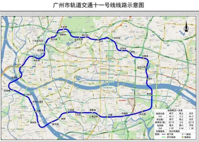 地鐵十一號(hào)線是廣州首條環(huán)線,全長(zhǎng)約44.2公里,串聯(lián)越秀、荔灣、海珠、天河、白云五個(gè)區(qū),全線共設(shè)32座車站,其中24座換乘站。