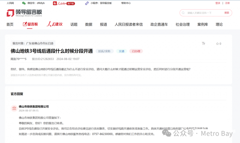 8月7日,記者從人民網(wǎng)留言板獲悉,佛山市地鐵集團有限公司公開答復(fù)市民稱,目前3號線在建段已開展安全評估,我司正在結(jié)合評估意見進行優(yōu)化整改。這一消息引發(fā)議論,有市民懷疑,佛山地鐵3號線后通段未通過安全評估。