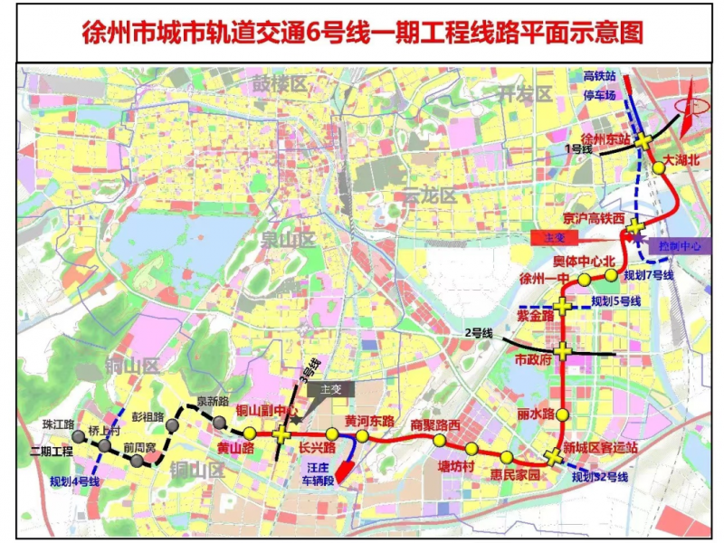 徐州地鐵6號線一期工程為一條反“L”形軌道交通線路,起點(diǎn)為黃山路與湘江路交叉口的黃山路站,途經(jīng)銅山區(qū)、云龍區(qū)與徐州經(jīng)開區(qū),終止于徐州東站東廣場,串聯(lián)銅山新區(qū)中心、新城行政商務(wù)中心、新城區(qū)客運(yùn)站、高鐵站等大型客流集散點(diǎn)。