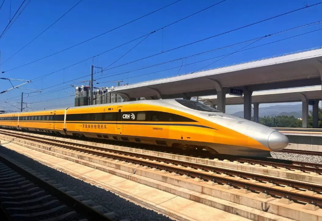 南珠高鐵南玉段正線全長193.31公里,最高設(shè)計時速350公里。按照規(guī)定,CRH380AJ-0201綜合檢測列車在逐級提速過程中,測試列車各區(qū)段最高運行速度不應(yīng)超過該區(qū)段線路允許速度的110%,因此,南珠高鐵南玉段最高檢測速度將達到每小時385公里。
