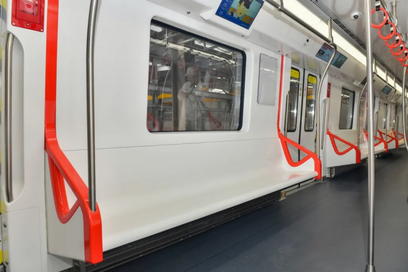 內(nèi)飾方面,地鐵車輛的座椅擋風(fēng)板造型靈感源于港口吊機(jī)框架,吊環(huán)設(shè)計(jì)則為水滴造型,客室座椅靠背與側(cè)墻整體聯(lián)通,線條流暢、優(yōu)美。