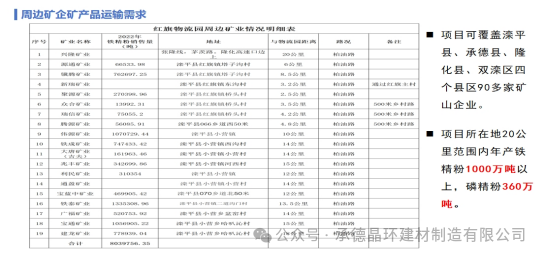 項目所在地運輸需求高度集中,20公里范圍內(nèi)年產(chǎn)鐵精粉1000萬噸、磷精粉360萬噸以上。項目可覆蓋灤平縣、承德縣、隆化縣、雙灤區(qū)四個縣區(qū)90多家礦山企業(yè)。