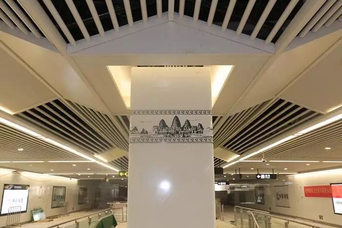 在裝飾風(fēng)格上,與1號線的“壯錦”元素、2號線的“銅鼓”元素不同,3號線采用廣西和東盟十國的建筑元素,提取東南亞坡屋頂特色建筑符號,結(jié)合東盟十國的國花元素對鑲嵌在柱面上的搪瓷花案進(jìn)行設(shè)計。這也成為此線路裝飾的一大亮點(diǎn)。