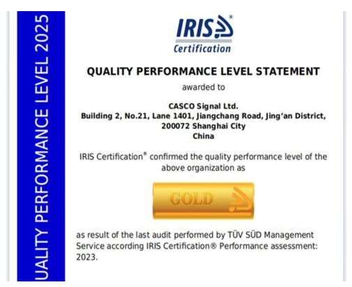 卡斯柯對安全質(zhì)量堅持嚴苛要求,是業(yè)內(nèi)成立獨立的系統(tǒng)安全部、將質(zhì)量和安全分立管理的首家企業(yè)。從2013年首次通過IRIS認證,到2022年獲得銀級績效認定,再到此次問鼎金級績效認證,十余年不懈努力,實現(xiàn)了質(zhì)量管理體系的持續(xù)升級。