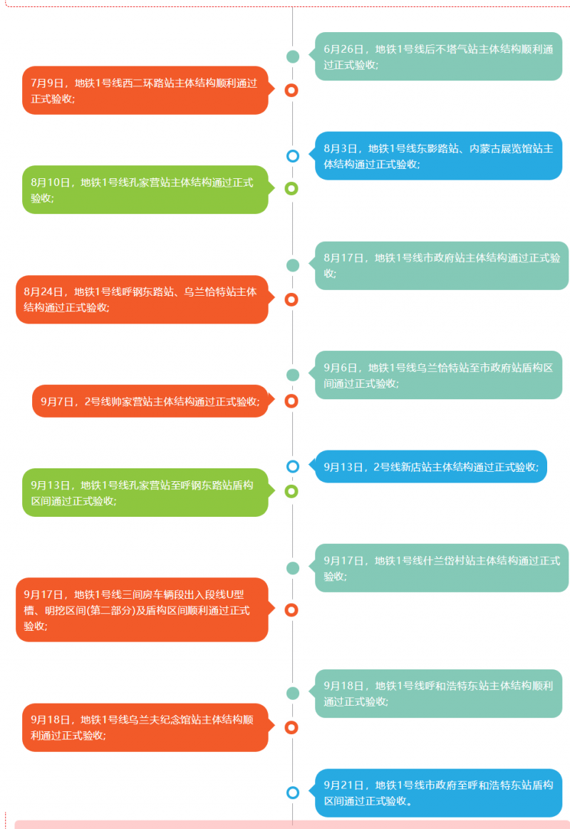 2018年9月21日,地鐵1號線市政府至呼和浩特東站盾構(gòu)區(qū)間通過正式驗收。至此,呼和浩特市地鐵1、2號線一期工程車站主體結(jié)構(gòu)及區(qū)間隧道分部工程已完成89項驗收,其中1號線完成11個車站、4個區(qū)間工程驗收,2號線完成2個車站工程驗收。