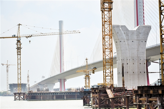 南沙港鐵路是珠三角西部貨運(yùn)通道的重要組成部分,是完善區(qū)域路網(wǎng)結(jié)構(gòu)的重要線路,有利于降低沿線地區(qū)企業(yè)物流成本,對(duì)于推進(jìn)我市珠西物流中心建設(shè)具有重要作用。記者在跨西江特大橋施工場(chǎng)地看到,西江兩端已經(jīng)有大型橋墩樹立起來,施工承臺(tái)也已經(jīng)延伸至西江中間,而在施工的西江特大橋旁邊就是已經(jīng)通車的廣中江高速二期濱江大橋。