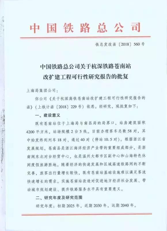 日前,杭深鐵路蒼南站改擴(kuò)建工程可行性研究報(bào)告獲鐵路總公司批復(fù),工程總投資估算6億元。