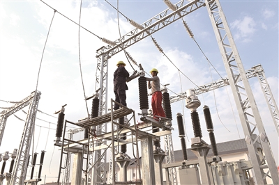 圖為10月8日,寧啟鐵路海門牽引站工程施工現(xiàn)場,技術(shù)人員正在安裝設(shè)備。