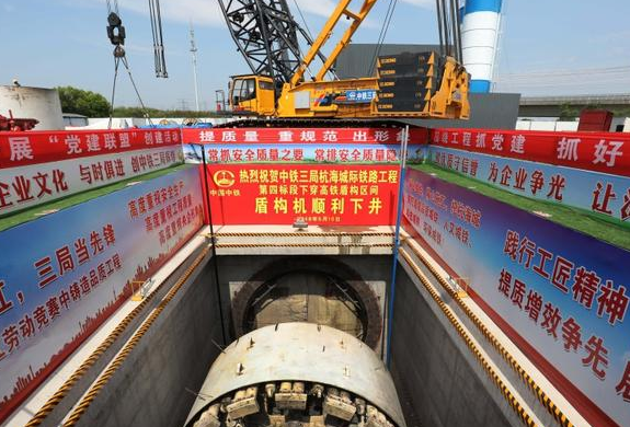 5月16日,海寧許村鎮(zhèn)報國村杭海四標(biāo)項目部施工現(xiàn)場,大型盾構(gòu)機(jī)正緩緩下井。這是繼5月8日二標(biāo)段之后,杭海鐵路第二臺盾構(gòu)機(jī)進(jìn)入地下作業(yè)。