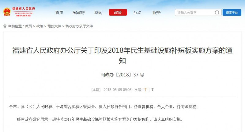 記者5月10日從福建省政府獲悉,經(jīng)福建省政府研究同意,省政府辦公廳已正式向全省印發(fā)《2018年民生基礎(chǔ)設(shè)施補(bǔ)短板實(shí)施方案》,并要求全省各地認(rèn)真組織實(shí)施。實(shí)施方案明確提出,2018年福建省將全面有序推進(jìn)城鄉(xiāng)民生基礎(chǔ)設(shè)施建設(shè)9大工程。