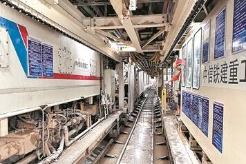 5月9日,在地鐵1號線史家灣站站臺東側(cè),南北兩個隧洞口傳出一陣陣轟轟的機(jī)器聲。其中,北側(cè)的隧洞口不時有裝滿渣土、管片的“電動小火車”進(jìn)出;南側(cè)隧洞口的盾構(gòu)機(jī),前端已深入洞中,正全力以赴向前推進(jìn)。