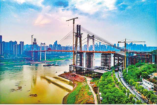 鵝公巖軌道交通環(huán)線專用橋全長1650米 主跨600米,雙塔雙索面五跨連續(xù)鋼箱梁自錨式懸索,由69段鋼箱梁組成,單段最重達408噸,首段鋼箱梁于2017年2月13日吊裝,歷時14個月安裝完成,7項施工技術(shù)獲國家發(fā)明專利。