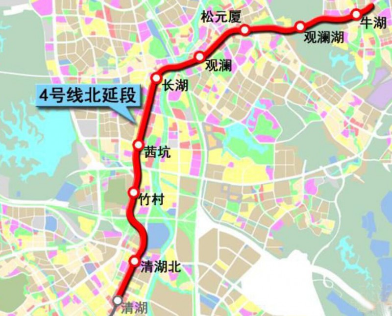 4號(hào)線北延線即4號(hào)線三期工程,是由清湖站牽出,沿觀瀾大道、高爾夫大道敷設(shè),到達(dá)牛湖站。