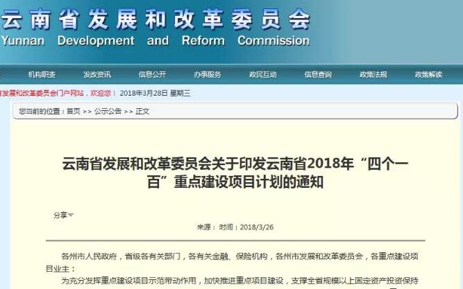 近日,云南省印發(fā)了《云南省2018年“四個(gè)一百”重點(diǎn)建設(shè)項(xiàng)目計(jì)劃》通知,重點(diǎn)加大綜合交通、能源、水利等五網(wǎng)基礎(chǔ)設(shè)施,八大重點(diǎn)產(chǎn)業(yè),新型城鎮(zhèn)化,教育、文體、衛(wèi)生等民生改善,資源節(jié)約和環(huán)境保護(hù)等項(xiàng)目建設(shè)。