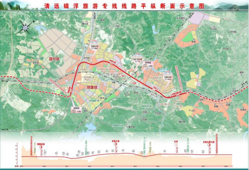 清遠(yuǎn)市磁浮旅游專線,以服務(wù)長隆主題公園旅游景區(qū)為主要功能,初期工程線路自銀盞溫泉站引出后上跨廣清大道、銀盞河,并行于廣清城際西側(cè),上跨京廣鐵路后于雄興工業(yè)區(qū)轉(zhuǎn)向東進(jìn)入長隆大道,而后于銀盞新村轉(zhuǎn)向北,至規(guī)劃際華園商服用地北側(cè)設(shè)長隆大道站,出站后下穿武廣客專芝山特大橋,再上跨清暉路與長隆大道立交,沿商業(yè)服務(wù)用地邊上行走,向東上跨長隆大道后再次上跨京廣鐵路,拐入森林大道北側(cè),于長隆主題公園門口設(shè)長隆主題公園站。里程范圍DK19+525~DK27+550,正線全長8.014公里,設(shè)銀盞溫泉、長隆大道、長隆主題公園等3站(遠(yuǎn)景預(yù)留長崗站),銀盞停車場1場。本線初、近期采用中低速磁浮列車3輛編組,目標(biāo)速度值100公里,建設(shè)總工期19個(gè)月,投資估算總額240402.52萬元。
