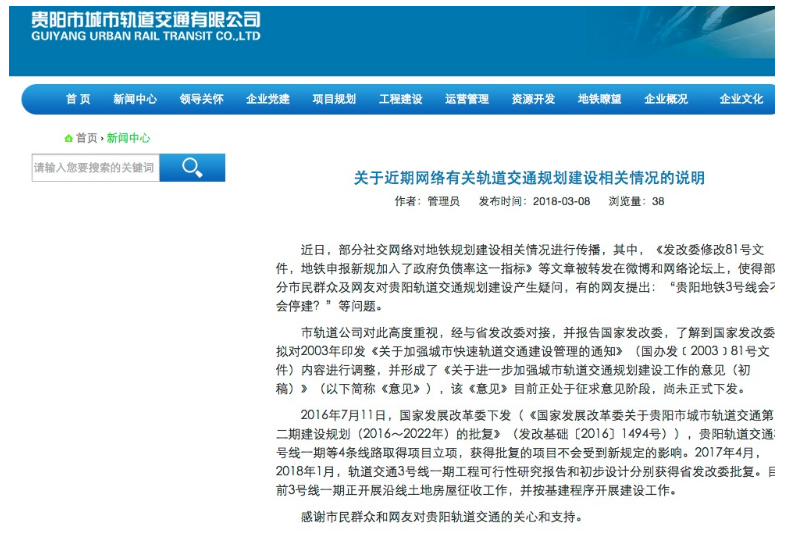 貴陽(yáng)地鐵方面稱,2016年7月11日,國(guó)家發(fā)展改革委下發(fā)《關(guān)于貴陽(yáng)市城市軌道交通第二期建設(shè)規(guī)劃(2016~2022年)的批復(fù)》,貴陽(yáng)軌道交通3號(hào)線一期等4條線路取得項(xiàng)目立項(xiàng)。隨后,2017年4月、2018年1月,貴陽(yáng)軌道交通3號(hào)線一期工程可行性研究報(bào)告和初步設(shè)計(jì)分別獲得省發(fā)改委批復(fù)。貴陽(yáng)地鐵方面同時(shí)強(qiáng)調(diào),目前3號(hào)線一期正開展沿線土地房屋征收工作,并按基建程序開展建設(shè)工作。