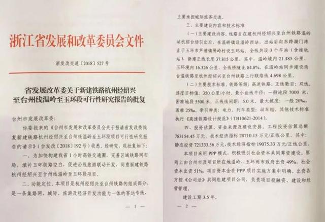 浙江省發(fā)改委在批復文件說,為加快構(gòu)建我省1小時高鐵交通圈,完善區(qū)域鐵路網(wǎng)布局,填補玉環(huán)鐵路空白,促進沿線旅游聯(lián)動開發(fā),同意新建鐵路杭州經(jīng)紹興至臺州線溫嶺至玉環(huán)段項目。