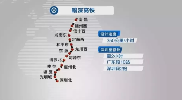 贛深鐵路建成通車后,深圳到贛州由現(xiàn)在接近7小時(shí)壓縮到2小時(shí),河源到深圳的時(shí)間也將壓縮到1小時(shí)以內(nèi)。待昌吉贛鐵路和贛深鐵路建成聯(lián)通后,深圳至南昌的高鐵運(yùn)行時(shí)間也將壓縮到4小時(shí)。