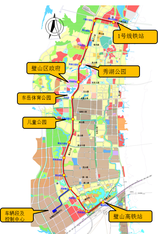 重慶市璧山區(qū)膠輪有軌電車建設項目可行性研究工程線路起點位于璧山高鐵站站前廣場,終點位于地鐵1號線璧山站,附近也規(guī)劃了成渝高鐵中線璧山北站。線路沿虎峰大道、黛山大道、六旗大道布設,串聯(lián)了璧山高鐵站、兒童公園、東岳體育公園、秀湖公園、璧山區(qū)政府、六旗樂園、璧山地鐵站,線路正線全長16.05公里,車站15座,均為高架車站,平均站間距1131米,最大站間距1690米(位于聚金大道站~兒童公園站),最小站間距655米(位于景山路站~六旗大道站),設車輛段1座,位于比亞迪電池廠附近,設控制中心一座,與車輛段合設。預計2018年12月底開工,2019年通車。