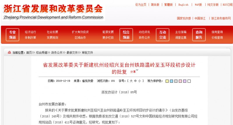 12月19日,浙江省發(fā)改委網(wǎng)站正式對(duì)杭紹臺(tái)鐵路溫嶺至玉環(huán)段初步設(shè)計(jì)進(jìn)行了批復(fù)。