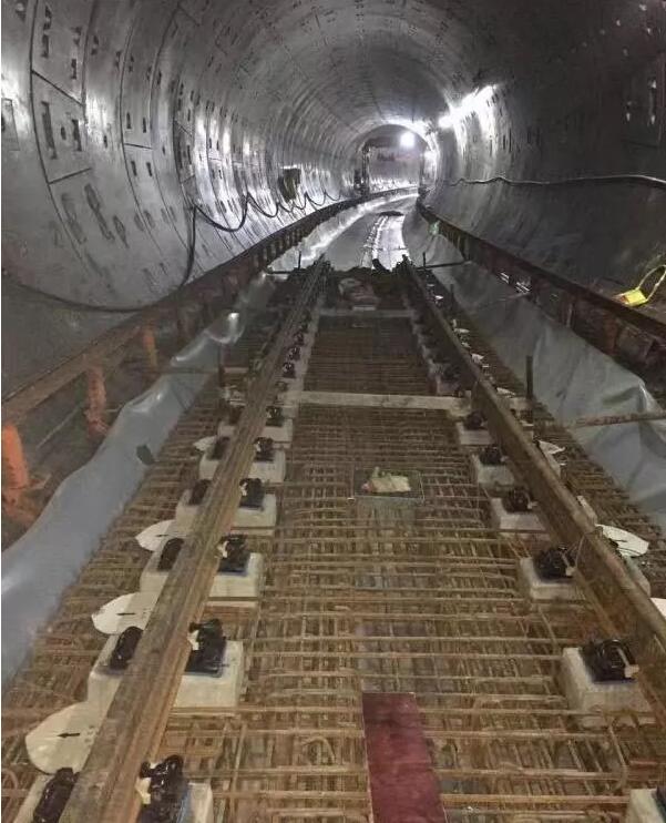 設(shè)置液體阻尼鋼彈簧浮置板道床,8.6公里軌道將混凝土道床板浮置于鋼彈簧隔振器上,隔振器內(nèi)放有螺旋鋼彈簧和液體粘滯阻尼劑,粘滯阻尼劑使鋼彈簧具有三維彈性,增加了系統(tǒng)的各向穩(wěn)定性和安全性,且能抑制和吸收固體聲,達(dá)到隔振減振的目的。